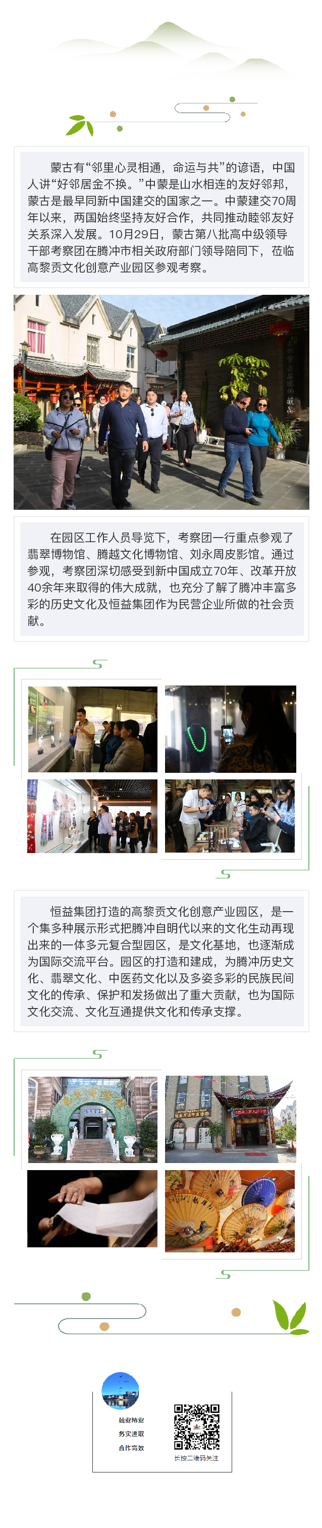 蒙古第八批高中級領(lǐng)導(dǎo)干部考察團(tuán)蒞臨高黎貢文化創(chuàng)意產(chǎn)業(yè)園區(qū)參觀考察 來源: 瀏覽量:6474 日期:2019-10-29 分享到: 上一篇:國家發(fā)改委價(jià)格認(rèn)證中心第四期培訓(xùn)會成員參觀考察騰沖翡翠博物館 下一篇:恒益集團(tuán)第三屆籃球賽揭開戰(zhàn)幕