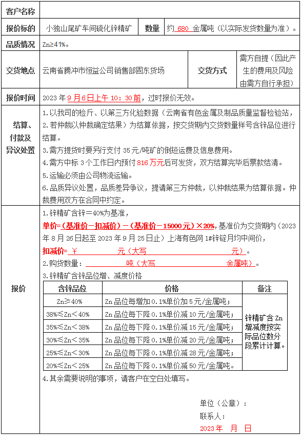 七、其它要求:(一)報(bào)價(jià)方中標(biāo)后不履行后續(xù)相關(guān)手續(xù)或未在三個(gè)工作日內(nèi)與我司洽談并簽訂《硫化鋅精礦購(gòu)銷合同》并預(yù)付816萬元貨款的,將視為不誠(chéng)信行為并承擔(dān)締約過失責(zé)任,我司將扣除50%的信譽(yù)保證金,并納入我司客戶誠(chéng)信檔案黑名單,我司有權(quán)拒絕該方今后競(jìng)價(jià)。(二)報(bào)價(jià)方競(jìng)價(jià)前已預(yù)付貨款且未中標(biāo)的,競(jìng)價(jià)后我司在十個(gè)工作日內(nèi)無條件退回該預(yù)付款(無息退還本金)。(三)具體購(gòu)銷事宜在中標(biāo)后雙方簽訂的購(gòu)銷合同中約定,本公告與購(gòu)銷合同不一致的,以購(gòu)銷合同為準(zhǔn)。(四)報(bào)價(jià)不符合要求的視為無效報(bào)價(jià)。(五)中標(biāo)后發(fā)貨原則上以標(biāo)書數(shù)量正負(fù)10%為準(zhǔn),如有超出或不足的雙方協(xié)商后以補(bǔ)充協(xié)議為準(zhǔn),且該范圍內(nèi)我司不承擔(dān)任何締約過失責(zé)任。