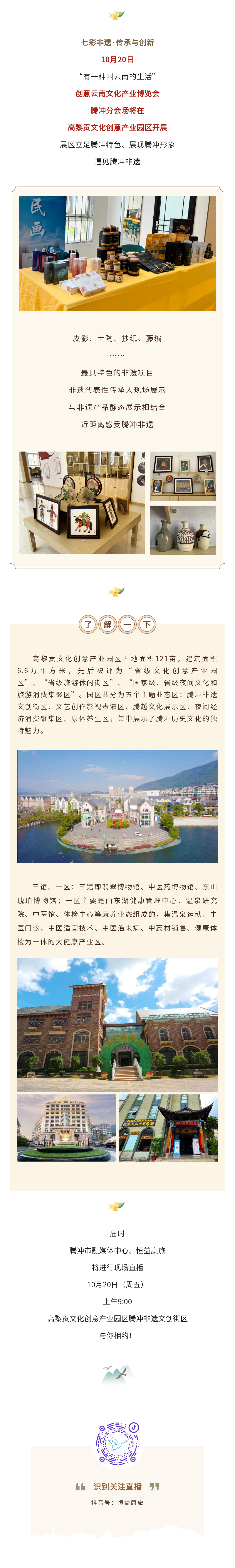 直播預(yù)熱丨文博會(huì)分會(huì)場(chǎng),相約騰沖高黎貢文化創(chuàng)意產(chǎn)業(yè)園區(qū) 來(lái)源: 瀏覽量:2830 日期:2023-10-19 分享到: 上一篇:云南文博會(huì),高黎貢文化創(chuàng)意產(chǎn)業(yè)園區(qū)展現(xiàn)騰沖多彩非遺文化 下一篇:快跟我來(lái),帶您去逛邊交會(huì)~