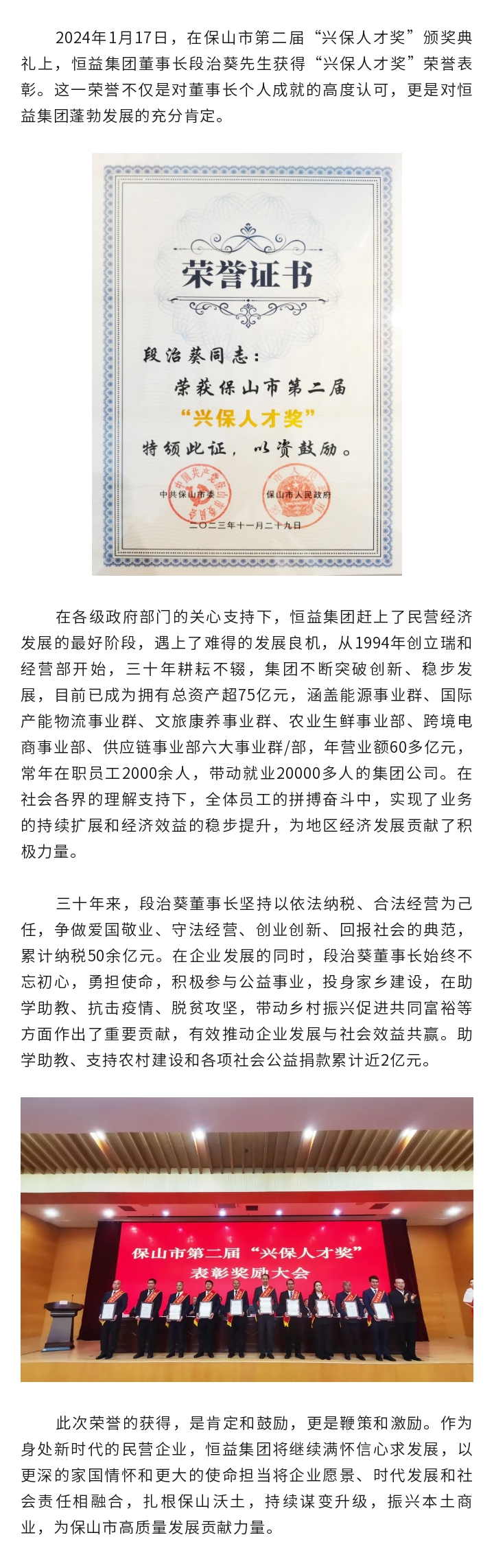 喜訊丨恒益集團(tuán)董事長(zhǎng)段治葵獲保山市第二屆“興保人才獎(jiǎng)”榮譽(yù)表彰 來(lái)源: 瀏覽量:3644 日期:2024-01-17 分享到: 上一篇:恒益集團(tuán)攜手北京知見(jiàn)行公益基金會(huì)為瑞麗地區(qū)教育事業(yè)捐贈(zèng)100萬(wàn)元 下一篇:揚(yáng)帆正當(dāng)時(shí) 逐潮擊浪高——記保山市第二屆“興保人才獎(jiǎng)”獲獎(jiǎng)?wù)叨沃慰?/a>