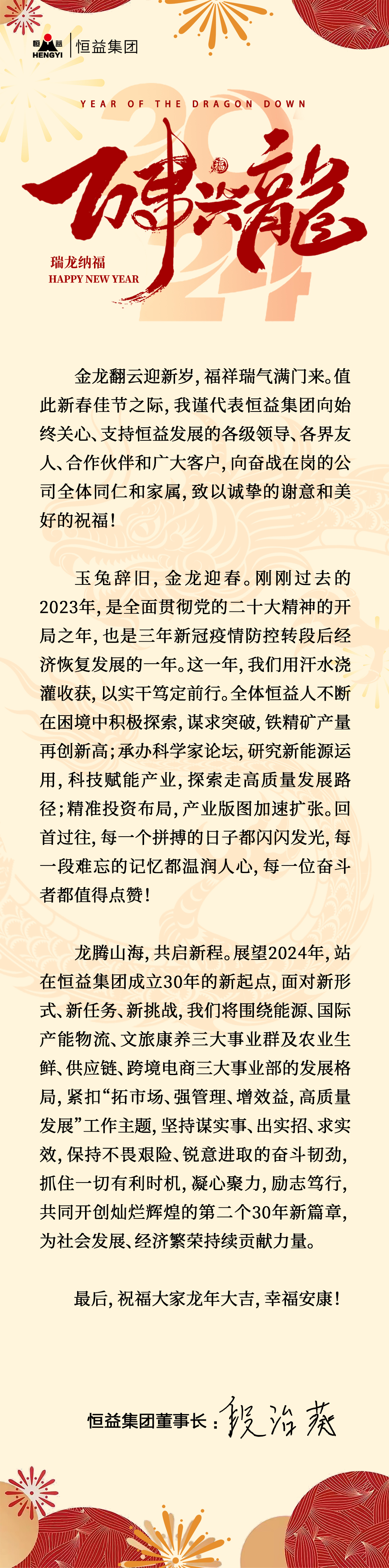 恒益集團(tuán)2024年新春賀詞 來源: 瀏覽量:3007 日期:2024-02-09 分享到: 上一篇:龍騰盛世,共舞新春丨恒益集團(tuán)受邀參加緬甸華僑界龍年新春慶典 下一篇:強(qiáng)強(qiáng)聯(lián)合集聚發(fā)展效能 合作共贏助力產(chǎn)業(yè)騰飛