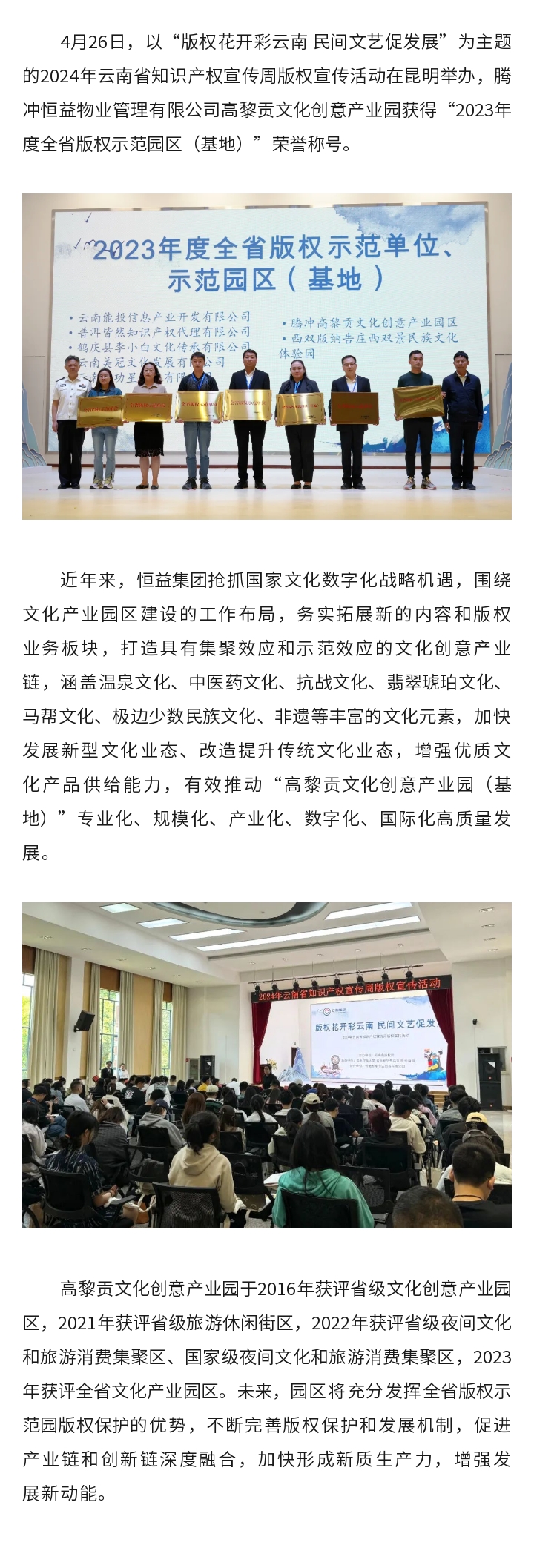 高黎貢文化創(chuàng)意產(chǎn)業(yè)園被評(píng)為2023年度全省版權(quán)示范園區(qū)(基地) 來源: 瀏覽量:2549 日期:2024-04-29 分享到: 上一篇:五一假期咋個(gè)耍?東山草原活動(dòng)來襲 下一篇:讓科技創(chuàng)新為騰沖農(nóng)業(yè)發(fā)展新質(zhì)生產(chǎn)力蓄勢(shì)賦能