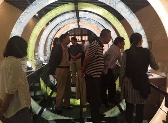 期間,調(diào)研組一邊聽(tīng)取工作人員介紹館內(nèi)設(shè)計(jì)理念,一邊仔細(xì)查看各藏品的擺放、空間設(shè)計(jì)等情況,對(duì)博物館的創(chuàng)意理念、設(shè)計(jì)表示贊許,并建議要多將科技產(chǎn)品與展品進(jìn)行結(jié)合,讓前來(lái)參觀的嘉賓有更好的直觀體驗(yàn),充分利用好博物館內(nèi)部空間,多方位展示特色,特別是對(duì)具有歷史意義的藏品展示方面,更凸顯出騰越翡翠文化的魅力。